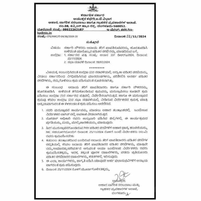 ಆಹಾರ ಇಲಾಖೆಯ ಮಾರ್ಗಸೂಚಿಯನ್ವಯ ಬಿಪಿಎಲ್ ಕಾರ್ಡ ಪಡೆಯಲು ಅನರ್ಹರಿರುವ ಕಾರ್ಡಗಳನ್ನು ರದ್ದು ಮಾಡಿ ಎಪಿಎಲ್ ಕಾರ್ಡಗಳಾಗಿ ಬದಲಾವಣೆ ಮಾಡುವ ಕ್ರಮವನ್ನು ಇಲಾಖೆಯ ಅಧಿಕಾರಿಗಳು ಕೈಗೊಳ್ಳುತ್ತಿದ್ದು ಈ ಸಂಬಂಧ ಆಹಾರ ನಾಗರಿಕ ಸರಬರಾಜು ಮತ್ತು ಗ್ರಾಹಕರ ವ್ಯವಹಾರಗಳ ಇಲಾಖೆಯ ಆಯುಕ್ತರು ಈ ಕೆಳಗಿನಂತೆ ಆದೇಶ ಹೊರಡಿಸಿದ್ದಾರೆ.
